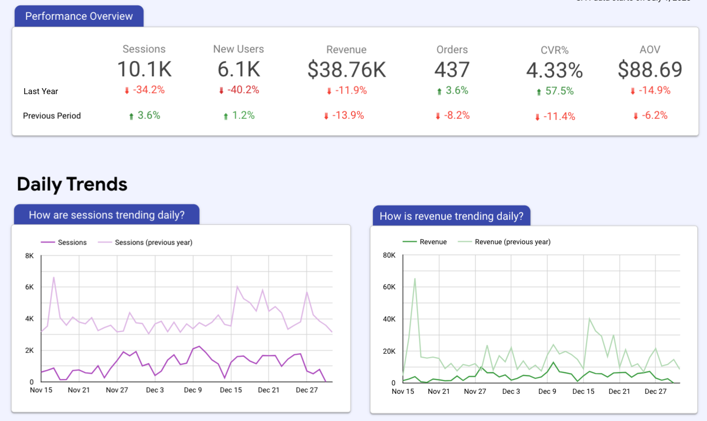 If you need year over year ecommerce comparisons, but didn’t have GA4 setup last year, this dashboard blends UA and GA4 data so you can see year over year performance.