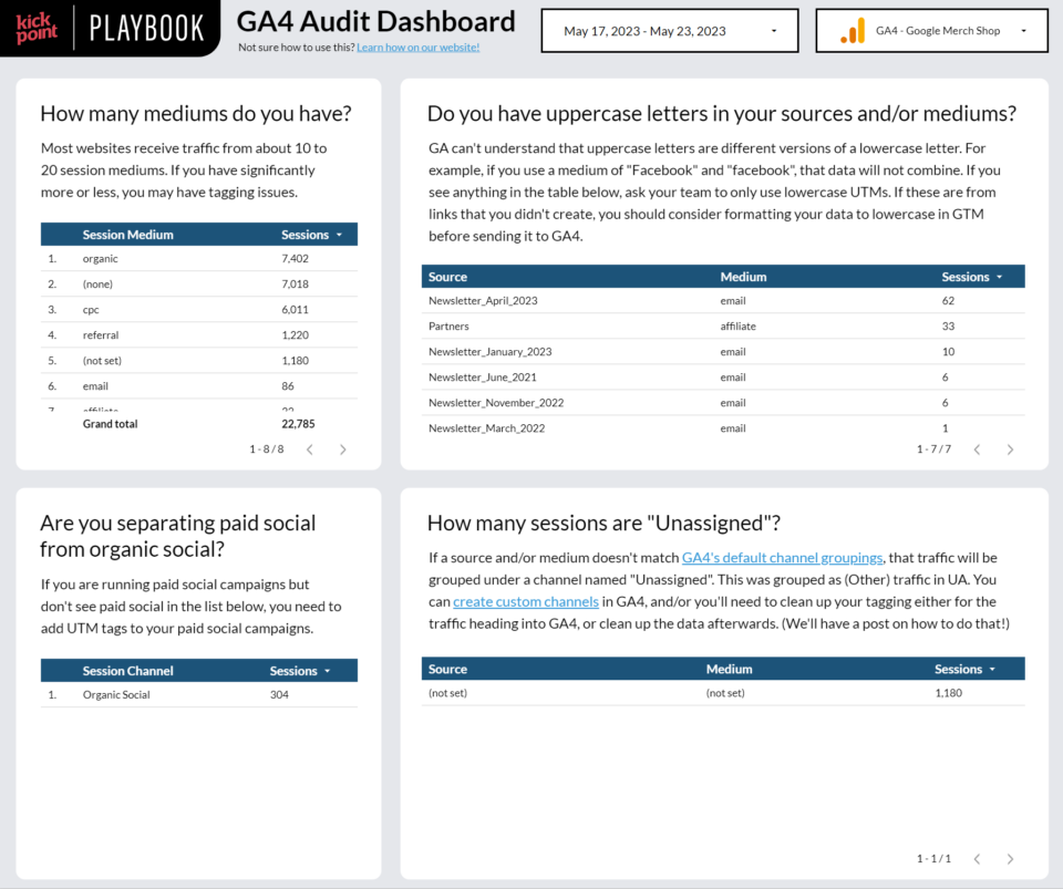Dana DiTomaso built this wonderful GA4 audit dashboard that highlights issues with you GA4 implementation. It’s built in Looker Studio, so anyone can connect their GA4 property and give it a whirl (no data is stored in Looker Studio since it is a direct connection to GA4).